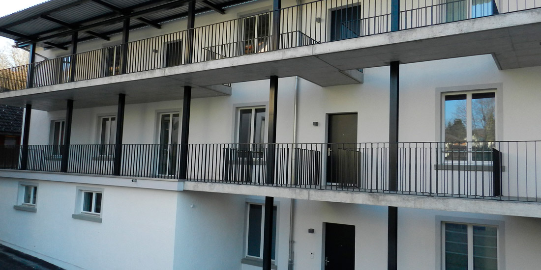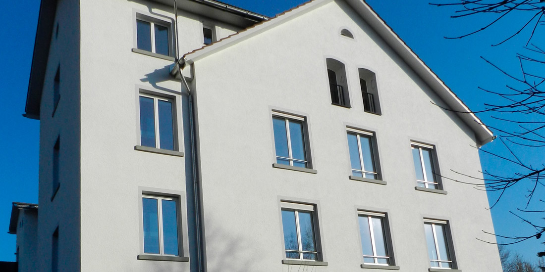Fassadenaufbau: Aqua Pura System / Mineralwollplatten, 0.034, 200 mm / STRU-Dübel, 255 mm / Deckputz Korngrösse 4-6 mm / Mineralischer FarbanstrichObjekt: Bäretswil, Spörriareal