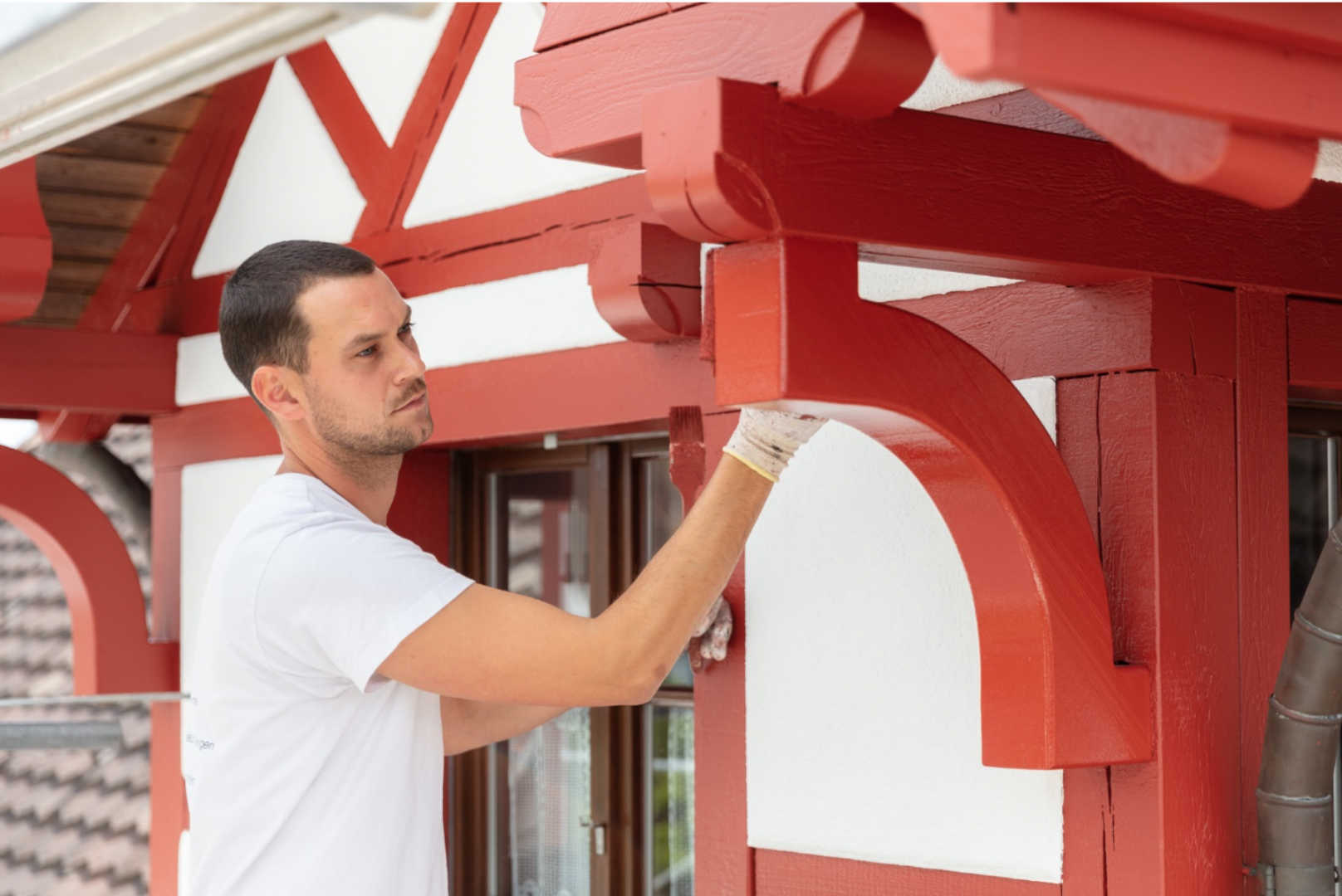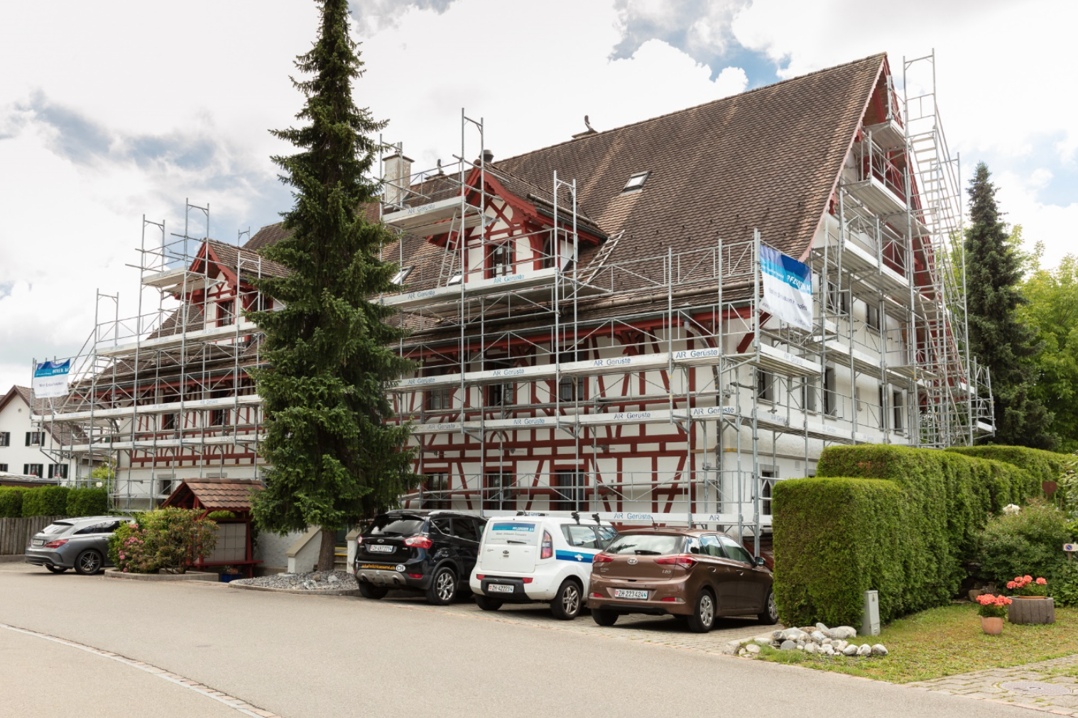 In Dürnten frischen unsere Maler ein Riegelhaus an, einschliesslich der Fensterläden und des Fachwerks, das sie schleifen, spachteln und dreifach mit ölhaltigem Decklack streichen.Frische Farbe für ein Riegelhaus