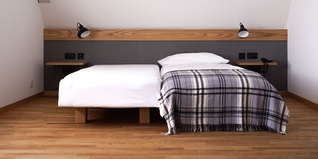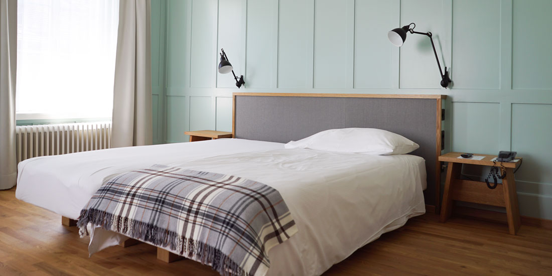 Es folgte der Rückbau der Oberflächen. «Es ist schwierig vorherzusagen, was unter der Oberfläche hervor kommt. Entsprechend mussten unsere Handwerker vorbereitet sein, um für jedes mögliche Problem eine entsprechende Lösung bereit zu halten», erklärt Roger Frei. Auch die Bauleitung muss solche Vorkommnisse von Anfang an in der Planung berücksichtigen. Denn diese können zu grossen zeitlichen und finanziellen Abweichungen führen. Um sicherzustellen, dass das Resultat den Erwartungen der Betriebsleitung und Nutzer entspricht, hatte man bereits einige Wochen vor Baubeginn ein Musterzimmer erstellt. So konnten noch Änderungen diskutiert und angepasst werden. Durch die passende Gestaltung und Materialisierung im Vorfeld durch die Innenarchitektin gab es jedoch kaum Differenzen in der Endausführung und der Umbau der restlichen 19 Zimmer konnte beginnen. Die alten Bodenbeläge wurden ausgebaut und durch ein einladendes Eichenparkett ersetzt. Die Wände wurden teilweise neu verputzt und tapeziert. Fensterleibungen und Decken erhielten einen neuen Farbton, um eine gemütliche Atmosphäre zu schaffen. Hinzu kamen offene Regale, wodurch die Räume modern und geräumig daher kommen.