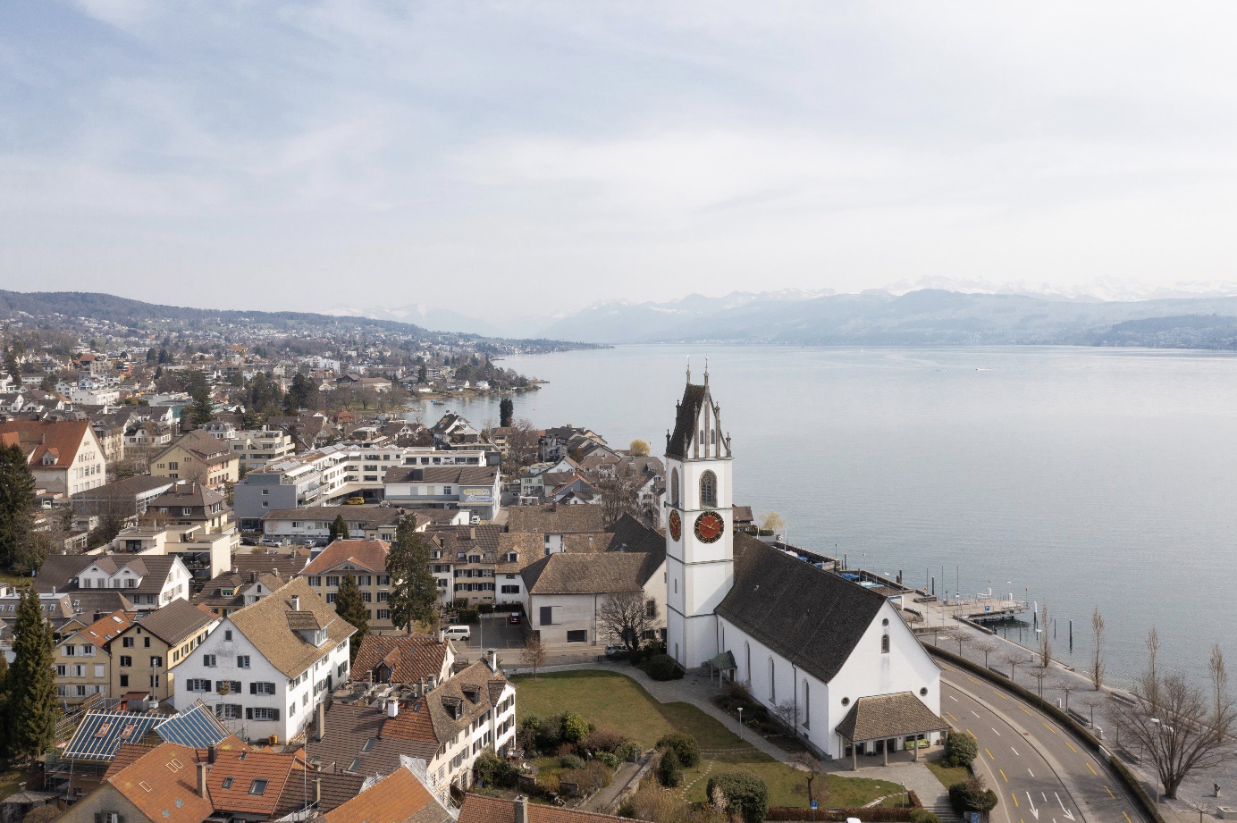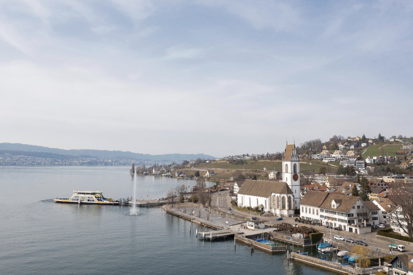 In der Mitte zwischen Zürich und Rapperswil thront der eindrucksvolle Kirchturm der reformierten Kirche Meilen über dem Zürichsee.Objekt: Kirchturm, Reformierter Kirchturm Meilen