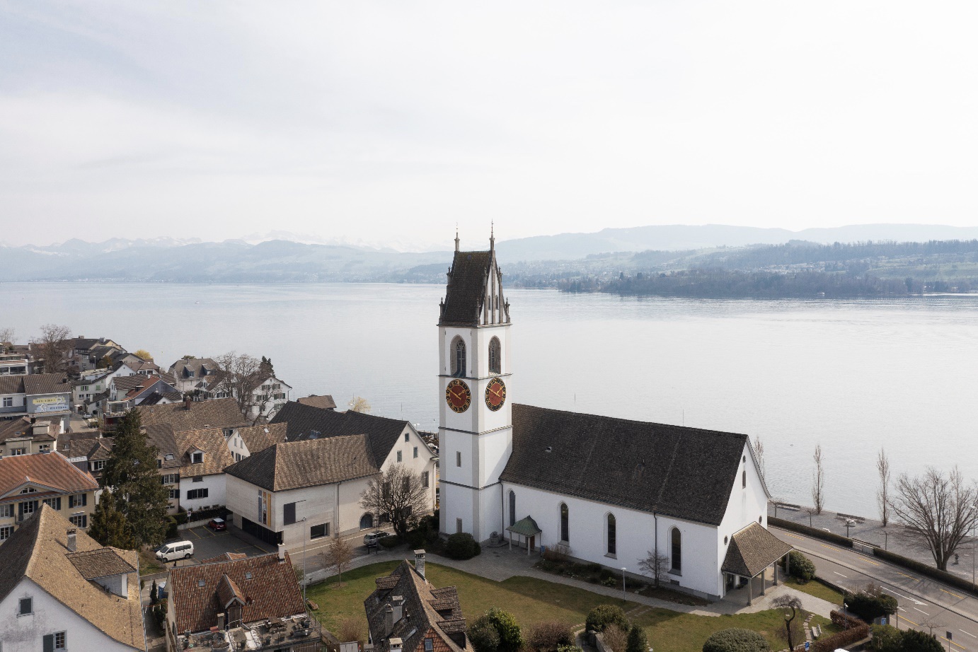Die wetterexponierte Lage verlangt eine hohe Qualität an die verputzten Oberflächen. Diese wurden im Rahmen einer Gesamtsanierung durch unser Unternehmen gründlich erneuert. Dafür wurde der komplette Turm neu gekalkt und die Ziffernblätter der Kirchturmuhr sowie die Vergoldungen poliert. Der Kirchturm erstrahlt nun stolz und hell über der Gemeinde Meilen und dem Zürichsee.