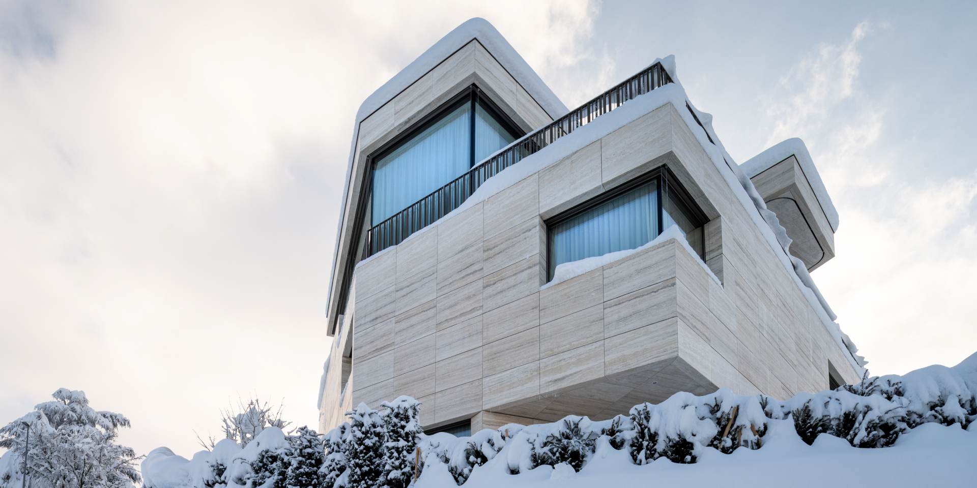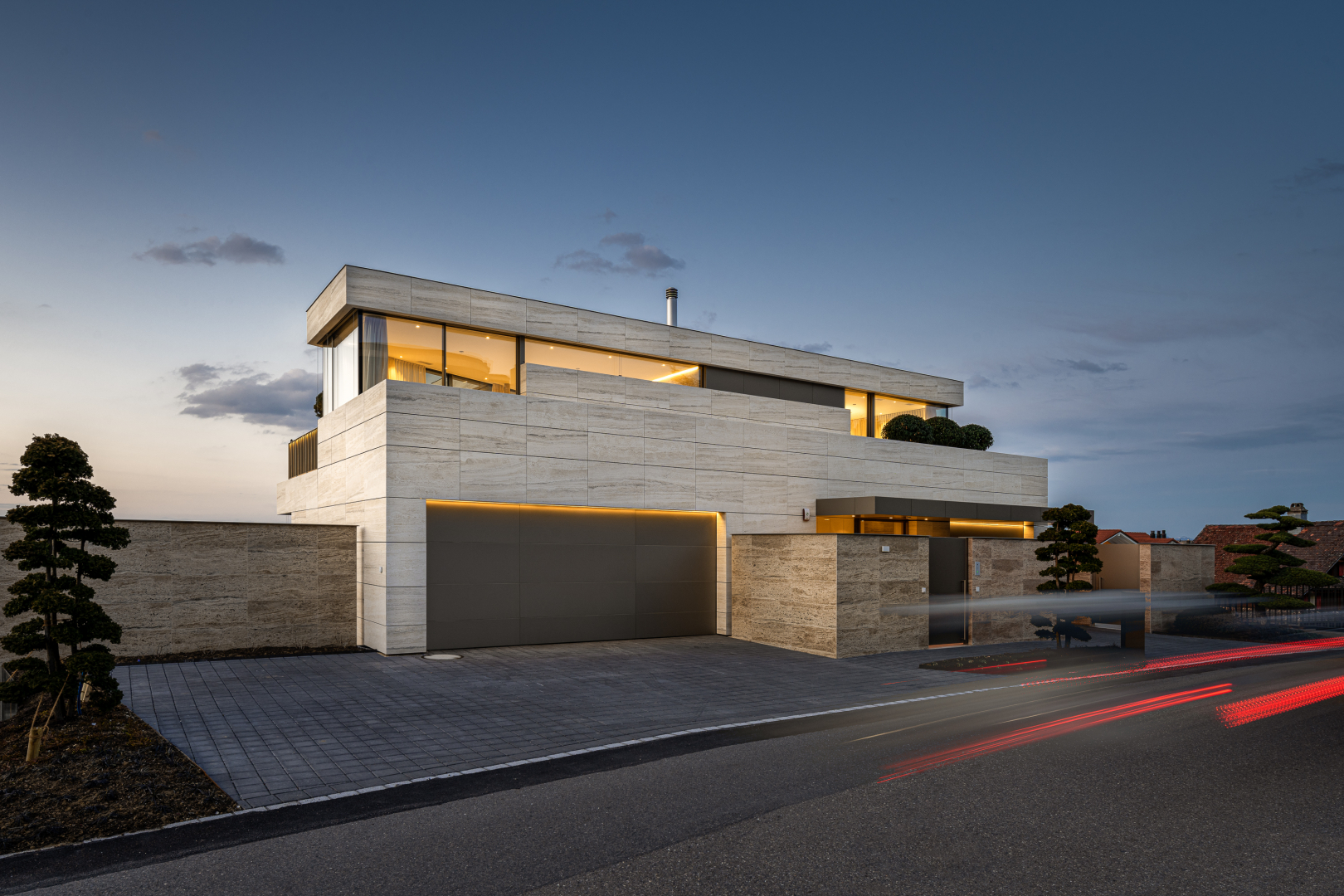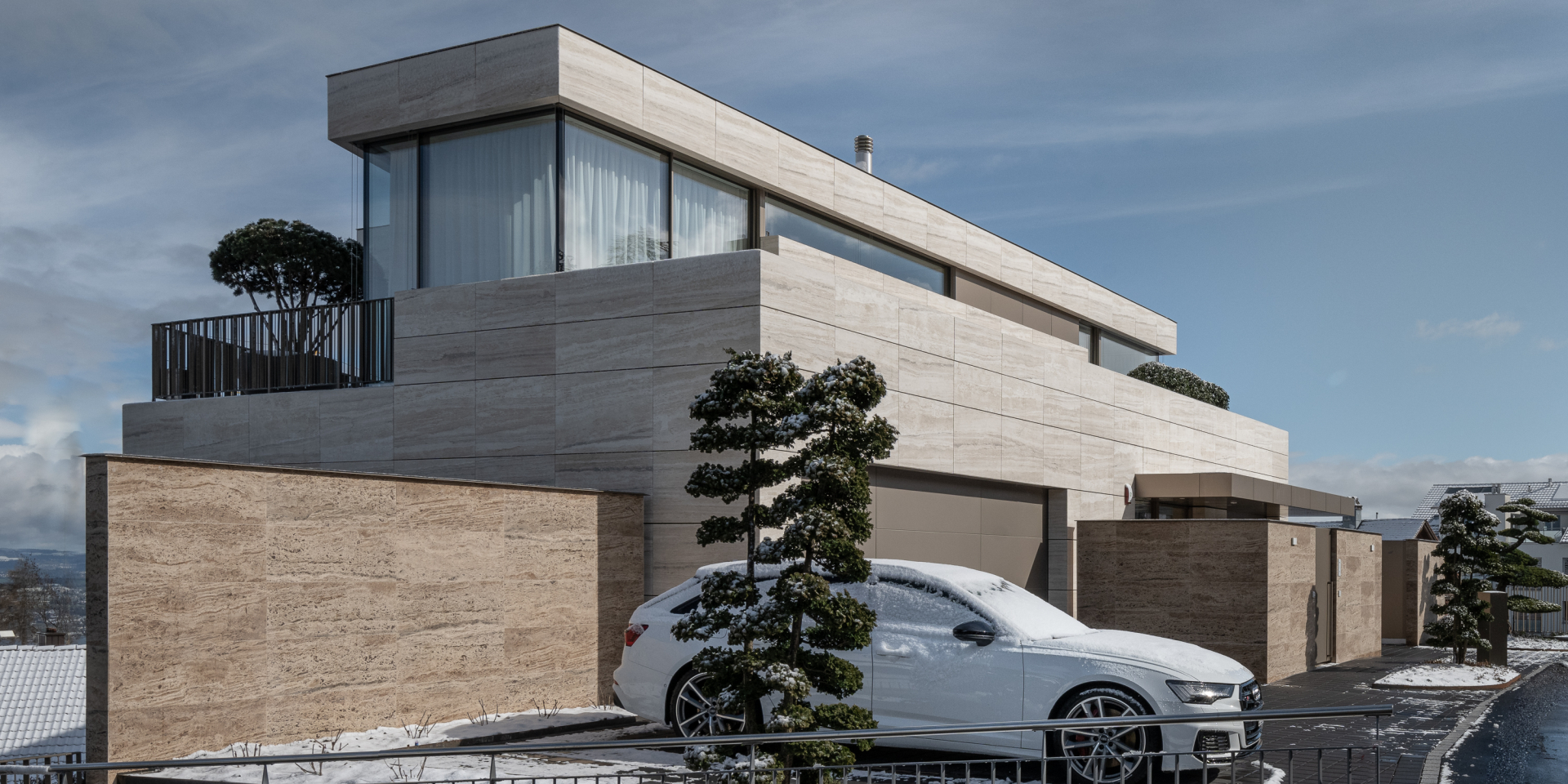 Neben einer hinterlüfteten Unterkonstruktion aus Aluminium wurden Naturstein-Platten verbaut, bei der als Besonderheit fertige Eckelemente verwendet wurden. Die 350m2 Natursteinfassade sind ein echter Eyecatcher und machen dieses Haus zu einem Wohntraum ganz nach dem Motto Stein und Design.