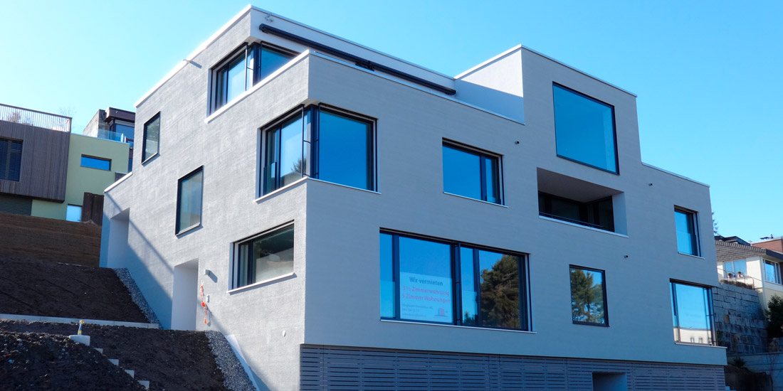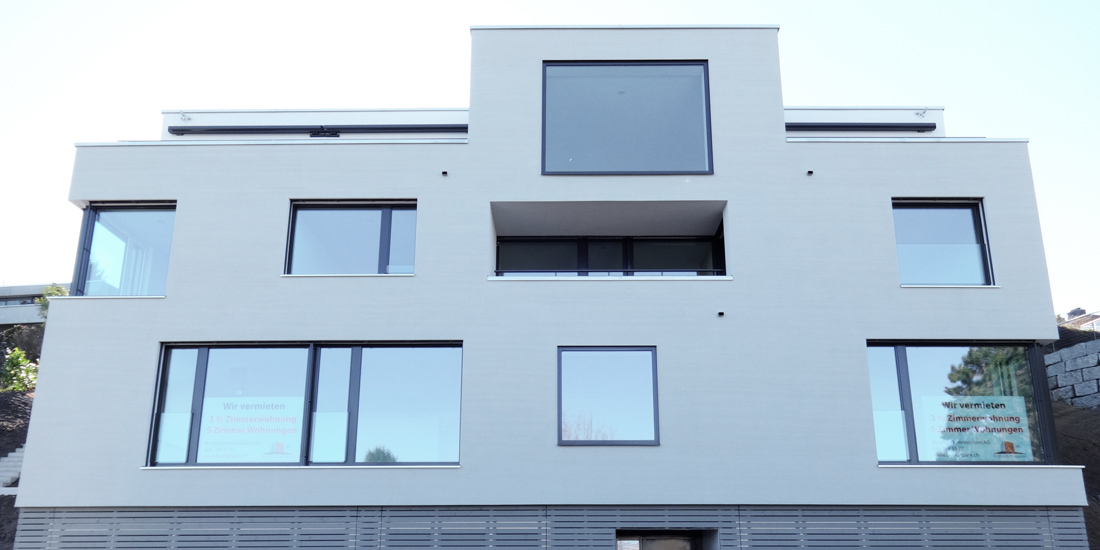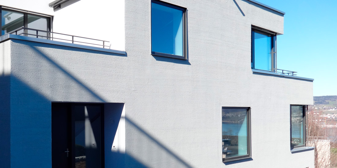 Fassadenaufbau: 240 mm EPS (0.030) mit STRU-Dübeln, Iso-Leichtkombimörtel, 1,0 mm Vollabrieb aussen, horizontaler Besenstrich und Farbanstrich.Objekt: Wädenswil, Holzmoosrüti