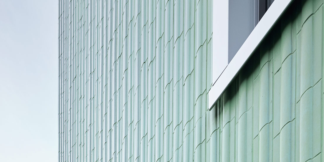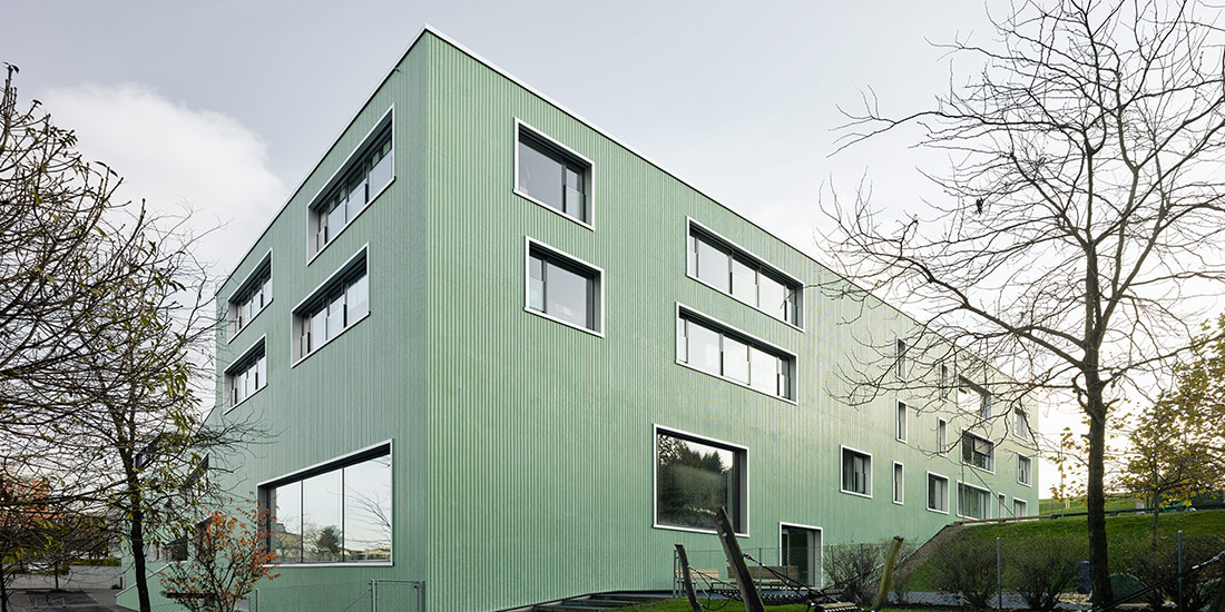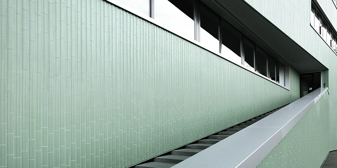 Fassadenaufbau: H-Konsole 160 mm / Tragwinkel 45/45/2.3 mm / Dämmung Mineralwolle Isover PBF 032, 160 mm / Traglatten Fi/Ta, 30x60 / 30x120 mm / Putzträgerplatte / Armierungsgewebe mit Einbettung / FeinsteinzeugplattenObjekt: Wädenswil, Zürich Internation School