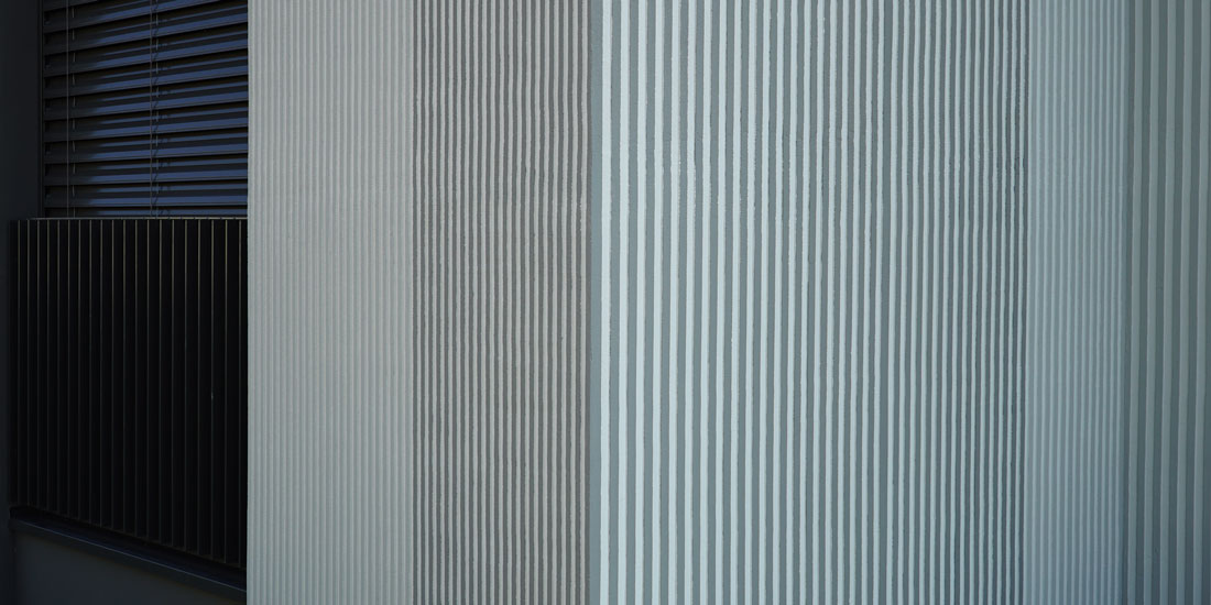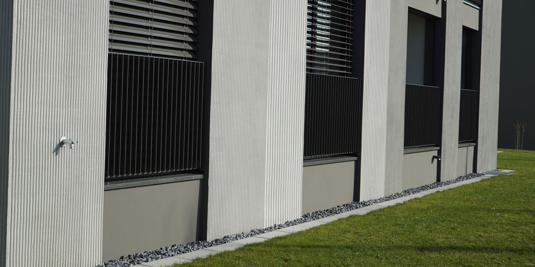 Gesamte Aussenfassade mit verputzter Aussenwärmedämmung inkl. Perimeterdämmung. Aufbau ab Mauerwerk bestehend aus EPS 15/20 mit Armierungskleber vollflächig aufgeklebt. Fassadenputz (Deckenstirn, Dachrand und Sockelanschluss) bei den stehenden Fensterbändern in Feinbeschichtung eingebettet bestehend aus Einbettungsmasse mit Armierung aus Glasfasergewebe und vollflächigem Überzug (2-fache Netzeinbettung). Anstrich, zweimalig gestrichen. Fassadenputz bei den übrigen Wandflächen, vertikal geführt aufgezogen mit unterschiedlich breiten Zahntraufeln. Vertikale Fassadensegmente in unterschiedlichen Farbnuancen gestrichen.
