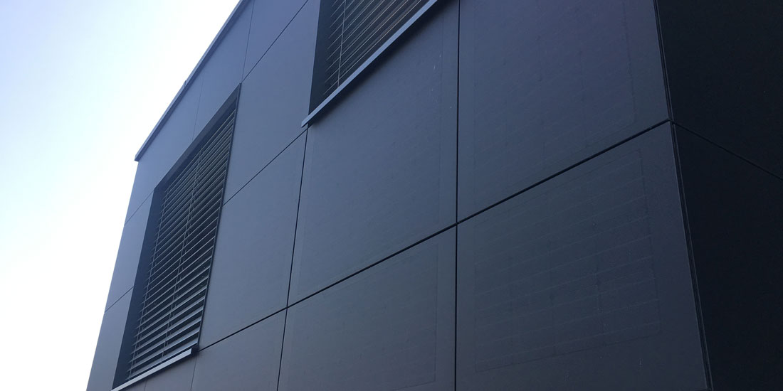 Das Gebäude ist mit Solarpanels auf dem Dach sowie an zwei Fassadenseiten ausgestattet. Das hat den Vorteil, dass die Panels mit einer Gesamtfläche von 168m2 im Sommer wie auch im Winter optimal bestrahlt werden und so jährlich rund 13'700 kWh Strom erzeugen. Dies entspricht einem Stromverbrauch von vier Einfamilienhäusern. Ein Batteriespeicher im Keller speichert den überschüssigen Solarstrom und speist ihn dann in das Netz des Hauses, wenn er benötigt wird. Die 137 kundenspezifischen Fotovoltaikelemente in 86 unterschiedlichen Grössen zeichnen sich durch ihre dezente Optik aus. Eine satinierte Glasoberfläche sowie homogen schwarze Solarelemente sorgen dafür, dass die Solarmodule nicht als solche erkennbar sind und sich stilvoll in die übrige Fassadengestaltung einfügen. Als Basis der Solarfassade dient eine sekundäre Unterkonstruktion mit einer Flumroc Duo Wärmedämmung (160 mm). Zum Schutz der Wärmedämmung wurde eine Fassadenbahn in Stamisol FA verlegt. Für die weitere Fassadenbekleidung wurden Outdoor Putzträgerplatten (12,5 mm) gewählt. Ein Silikat Deckputz in Betonoptik, ein Anstrich in dunkler Thermofarbe und offenen Fugen runden das einzigartige Objekt ab.