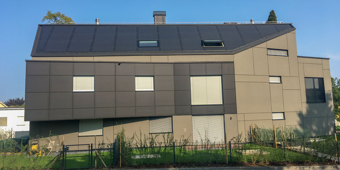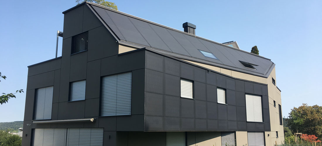Das Projekt Three in One in Zollikerberg besticht durch seine aussergewöhnliche architektonische Ästhetik, welche Solarpanels in ein harmonisches Gesamtbild einbettet. Der Bauherrschaft war es ein wichtiges Anliegen, einen energieautarken Neubau mit Solarstrom zu realisieren, ohne Einbussen in Bezug auf die Optik hinnehmen zu müssen. Das moderne Mehrgenerationenhaus, an dessen Realisation der Fassadenbau der Firma Schlagenhauf massgeblich beteiligt war, bringt diese beiden Anforderungen eindrücklich in Einklang.